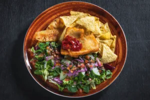 A wheat tortilla filled with breaded chicken, tomato mayonnaise, parmesan mayonnaise, house pickles, Pico de Gallo, nachos crumble, spring onion,…