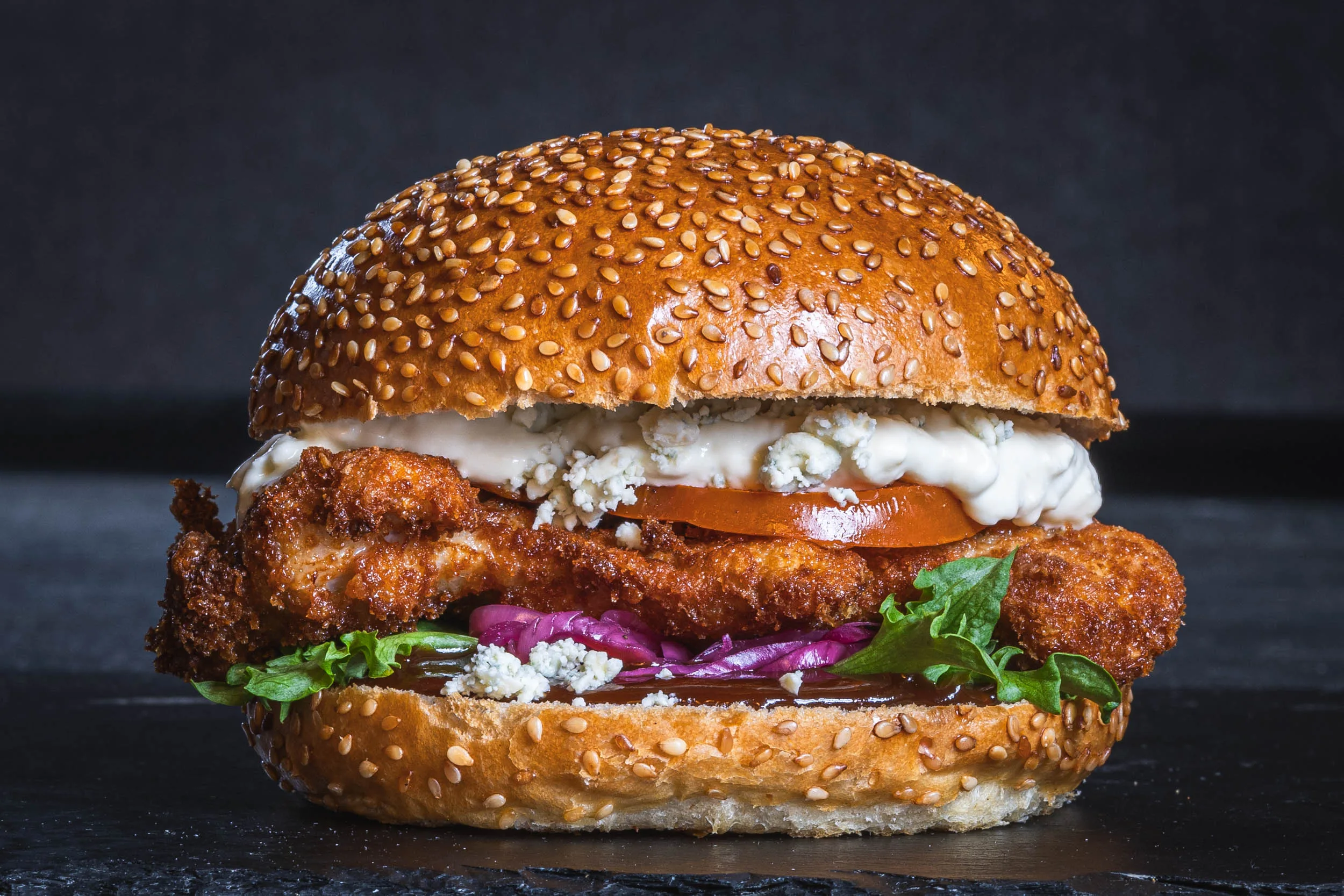 Aura blue cheese sauce, Aura crumbles, Chef’s bbq, grilled tomato, pickled red onion, lettuce