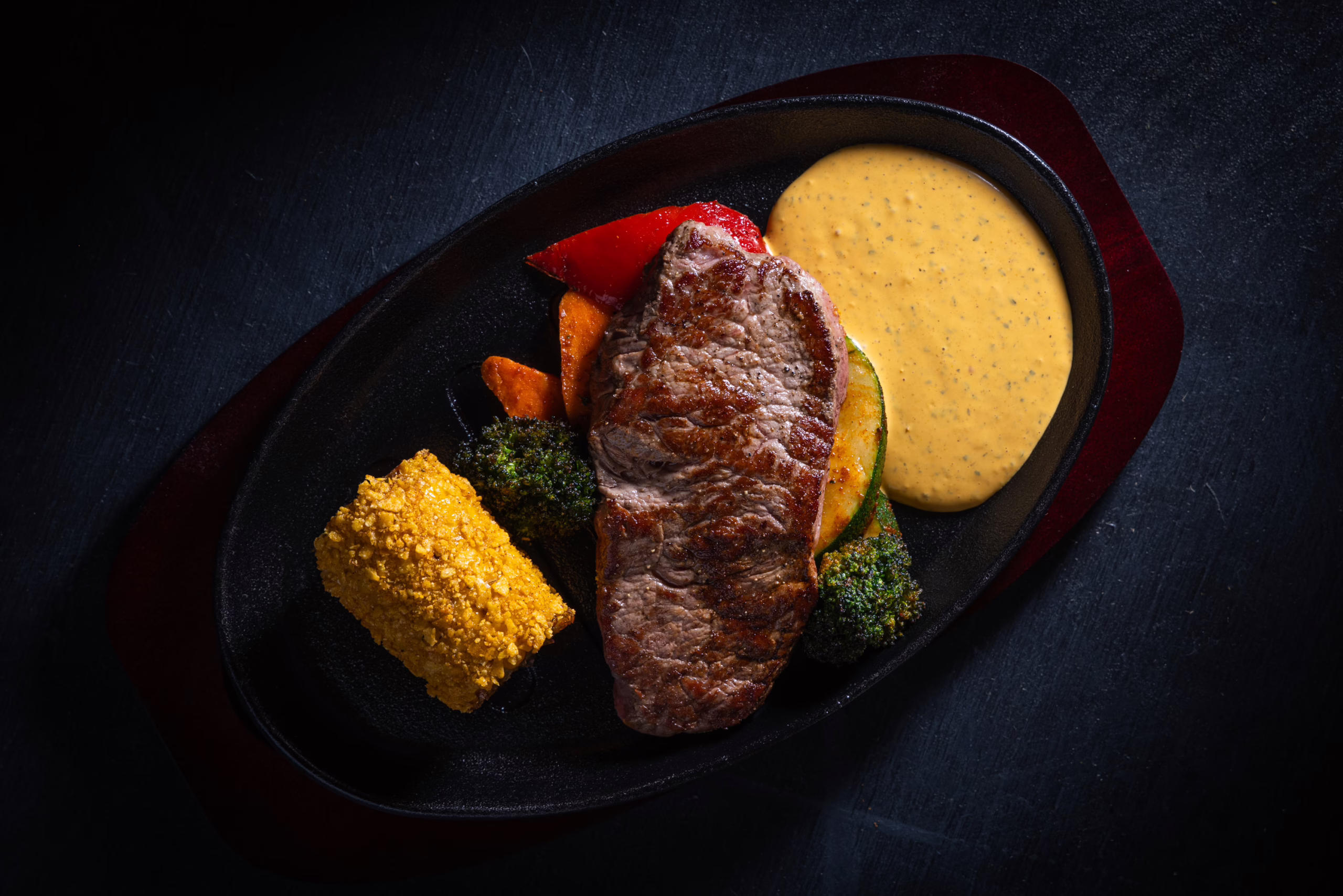 Two steaks: 36,90 €Panchos bearnaise sauce, corn coated with mayonnaise and nachos, grilled vegetables.