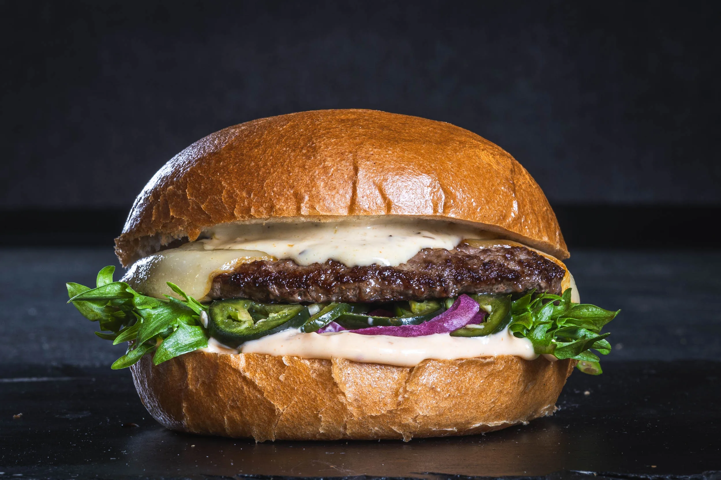 Beef patty, Port Salut cheese, chipotle mayonnaise, jalapeño mayonnaise, pickled jalapeños, pickled red onion, lettuce