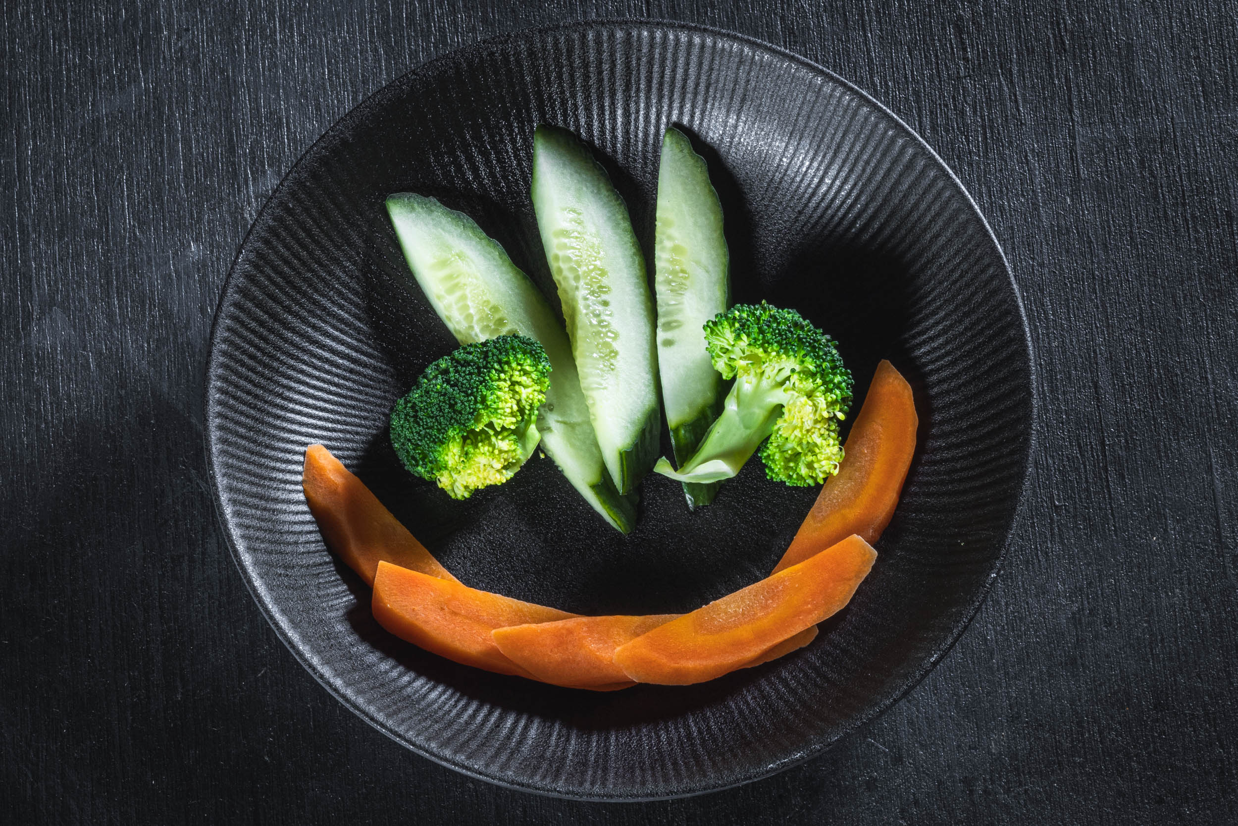 Steamed carrots and broccoli, cucumber sticks