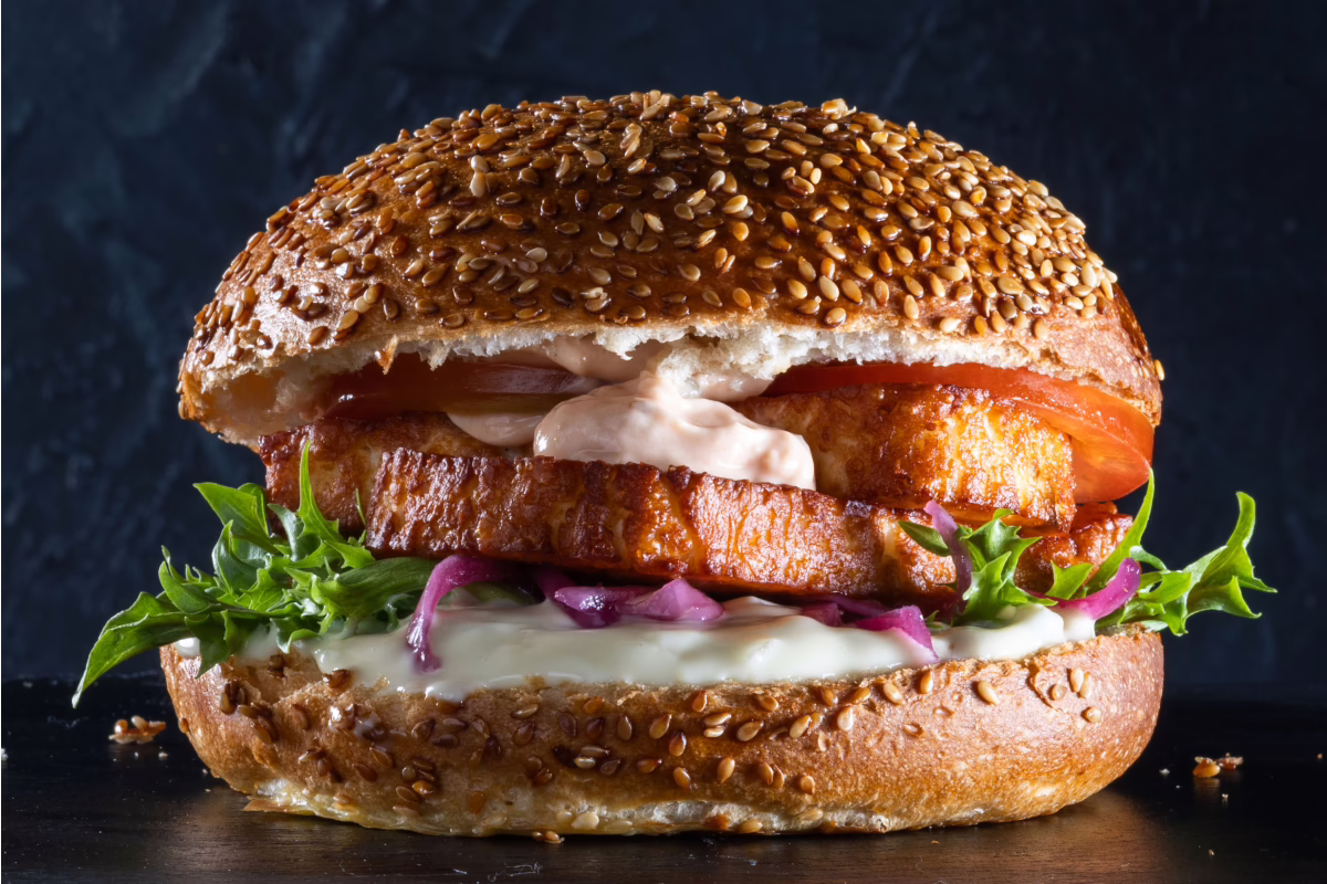 Deep-fried halloumi, jalapeño mayonnaise, grilled tomato, tomato mayonnaise,lettuce, pickled red onion.
