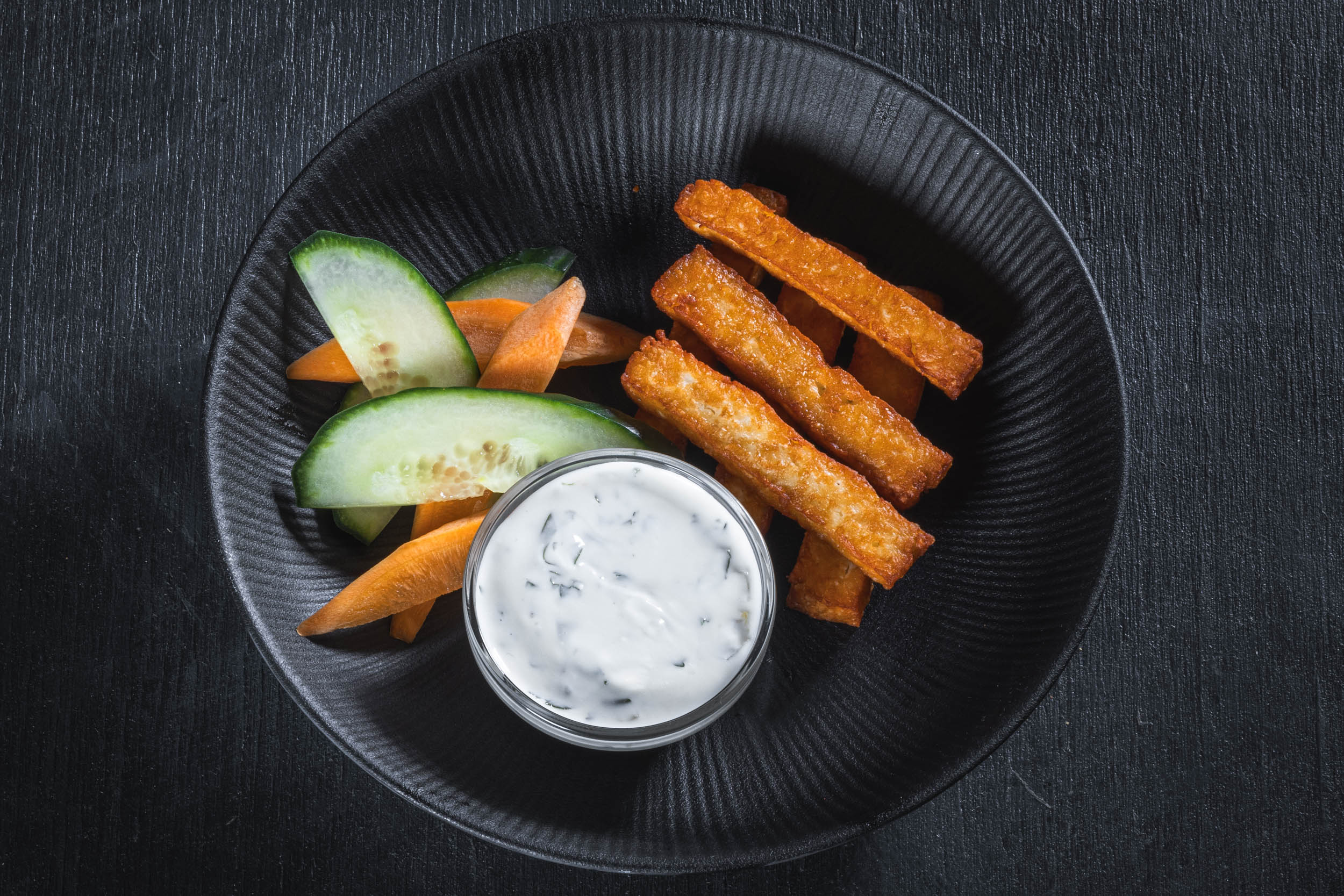 Deep-fried halloumisticks, cucumber, carrot, Fresh Mexican -dip.