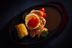 Paneroitua kanaa, pariloitua vuohenjuustoa, pahishilloa, Panchon remua, salaattia, marinoitua punasipulia.