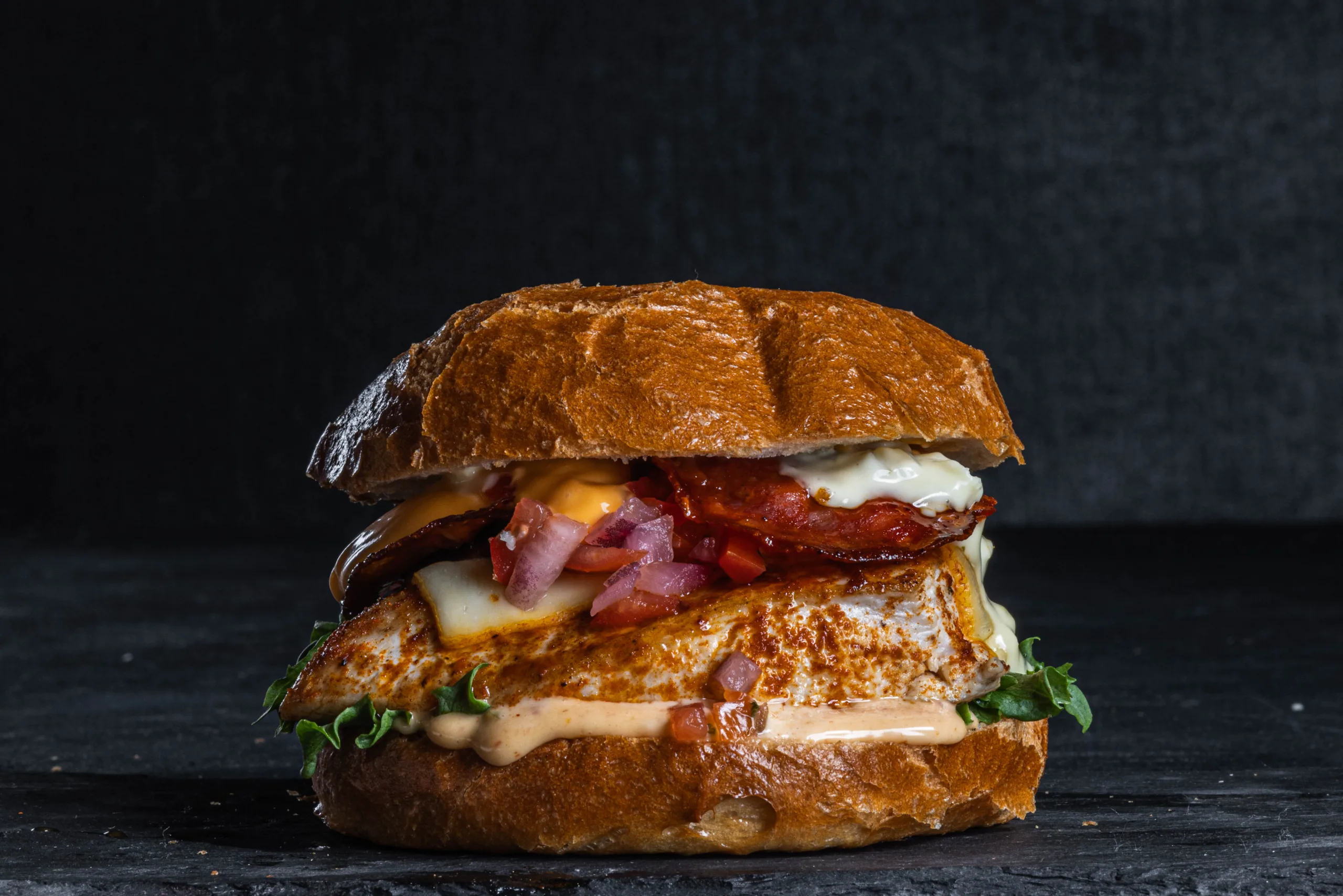 Pariloitua kanan rintafileetä, chorizoviipaleita, juustokastiketta, kermaista Port Salut -juustoa, kurkkumajoneesia, chipotlemajoneesia, Pico de Galloa, salaattia.