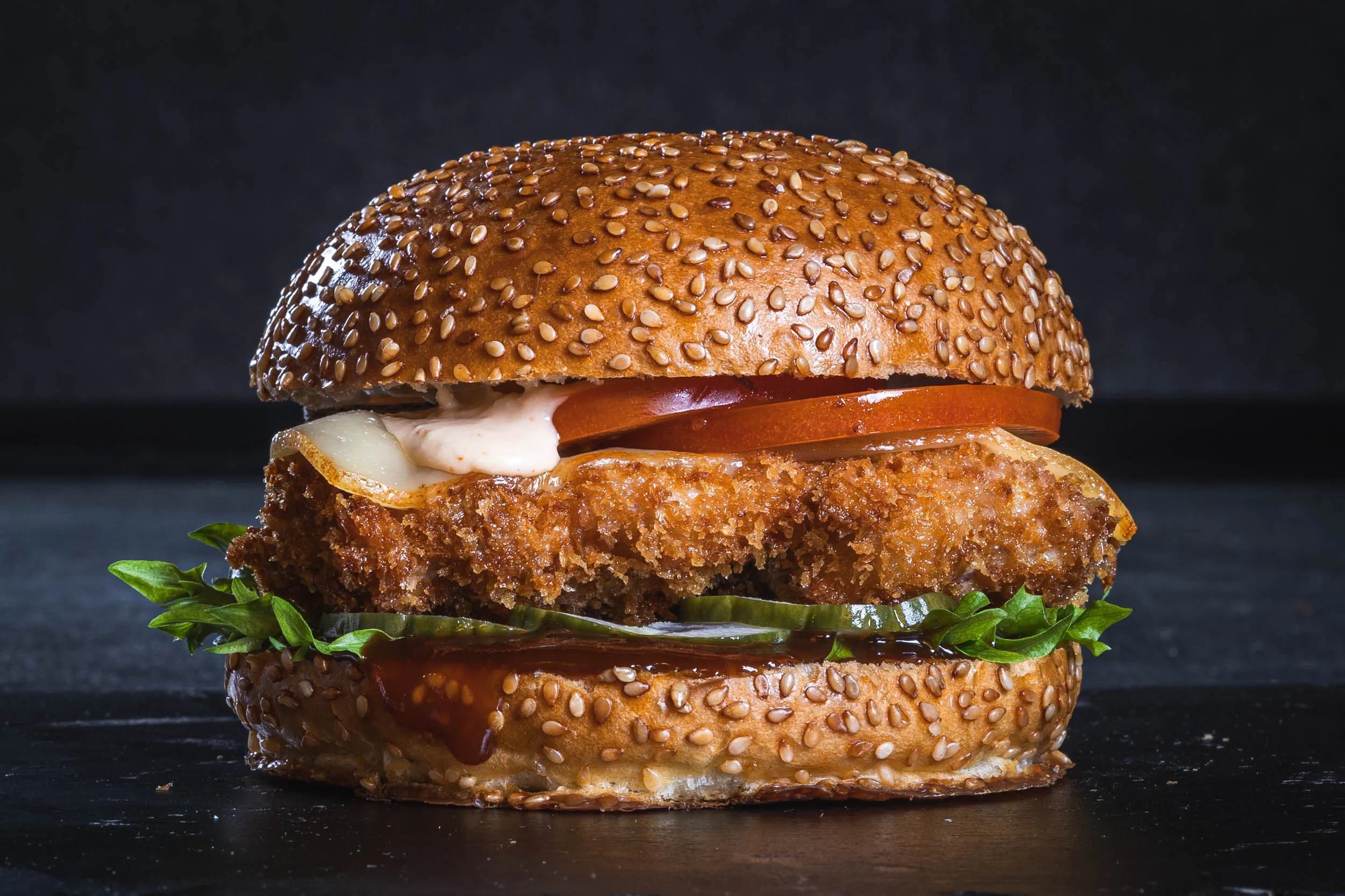 Paneroitua kanaa, Port Salut- juustoa, Chef´s bbq, burgermajoneesia, pariloitua tomaattia, Talon maustekurkkua, salaattia.