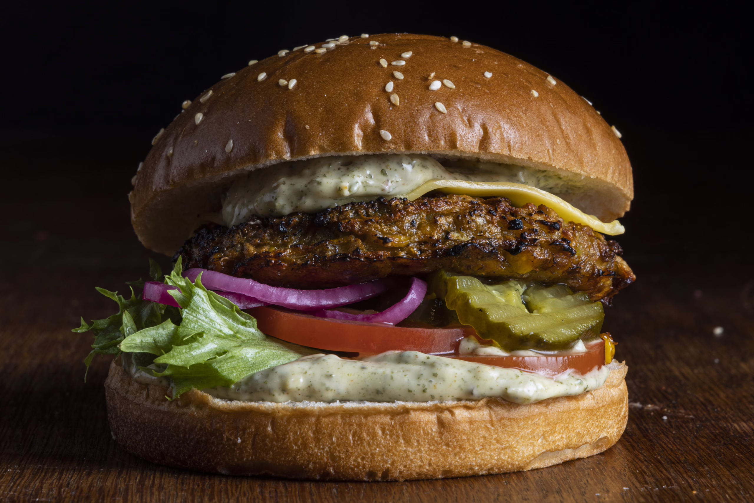 Kasvispihvi, tomaattimajoneesia, vegeviipale, marinoitua punasipulia, salaattia, tomaattia, Talon maustekurkkua.