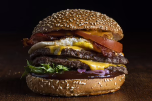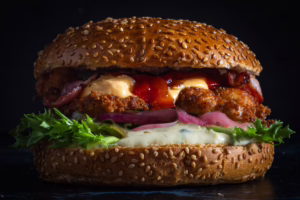 Burgerpihvi, rapeaa pekonia, juustokastiketta, jalapenomajoneesia, pahishilloa, salaattia, marinoitua punasipulia.