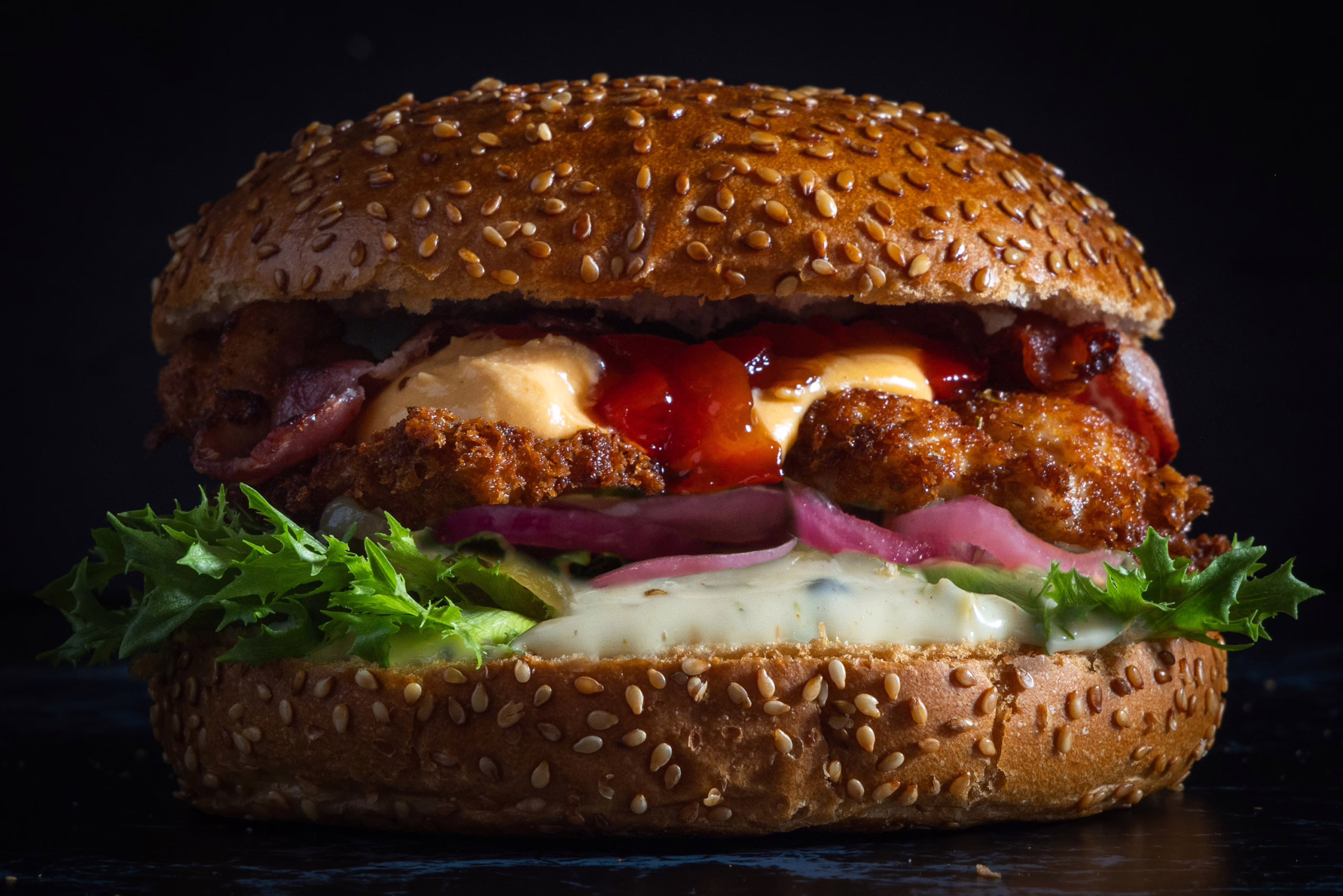 Paneroitua kanaa, rapeaa pekonia, juustokastiketta, jalapenomajoneesia, pahishilloa, salaattia, marinoitua punasipulia.