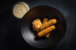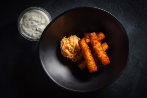 2 x sipulirengas, 2 x mozzarellatikku, 2 x cheddarjalapeno, coleslaw-salaattia, Fresh Mexican -dippi.