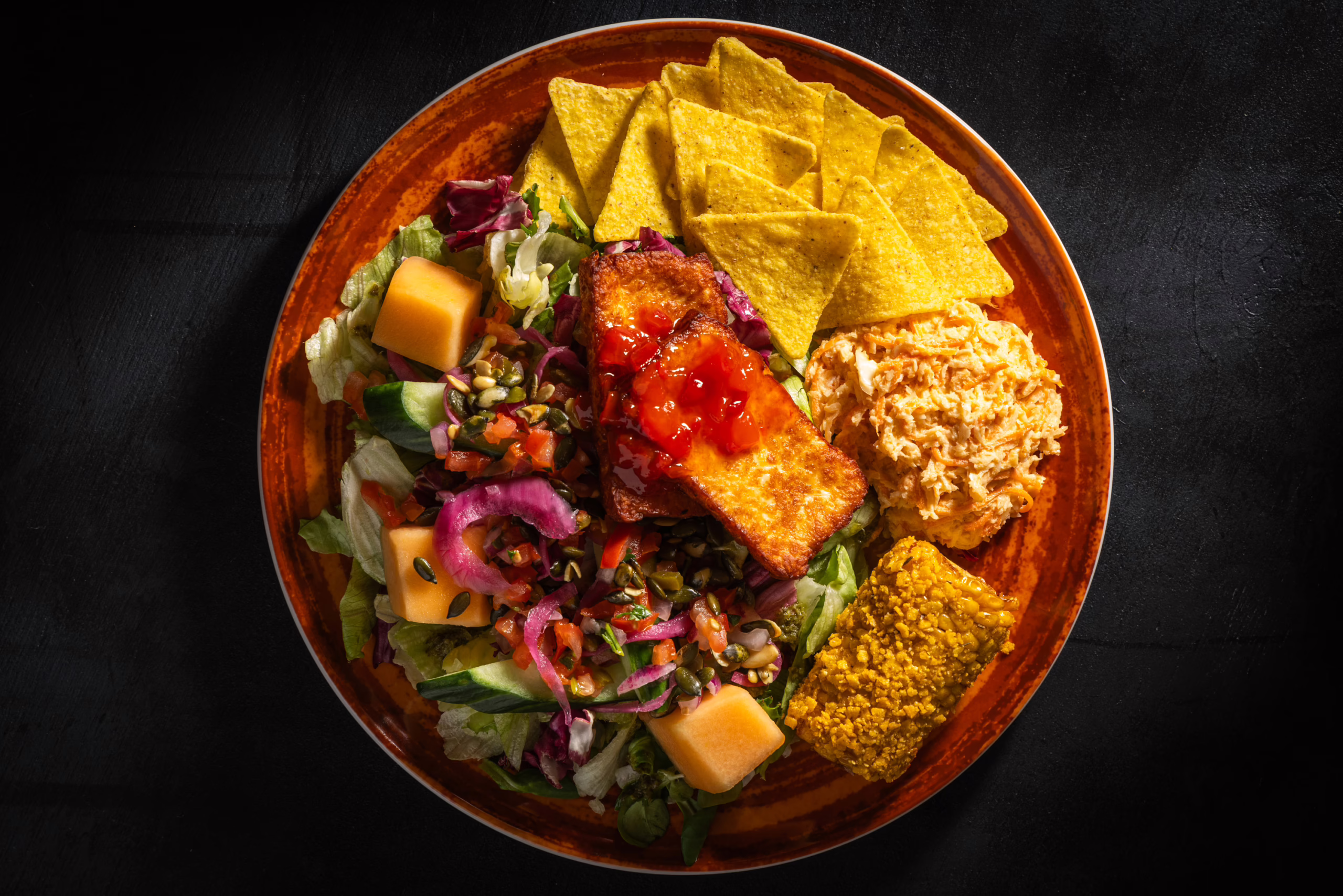 Salaattisekoitusta, coleslaw-salaattia, Pico de Galloa, kurkkua, marinoitua punasipulia, kevätsipulia, paahdettuja kurpitsansiemeniä, cantaloupemelonia, nachoja, majoneesi-nachokuorrutettu maissi, yrttiöljyä.