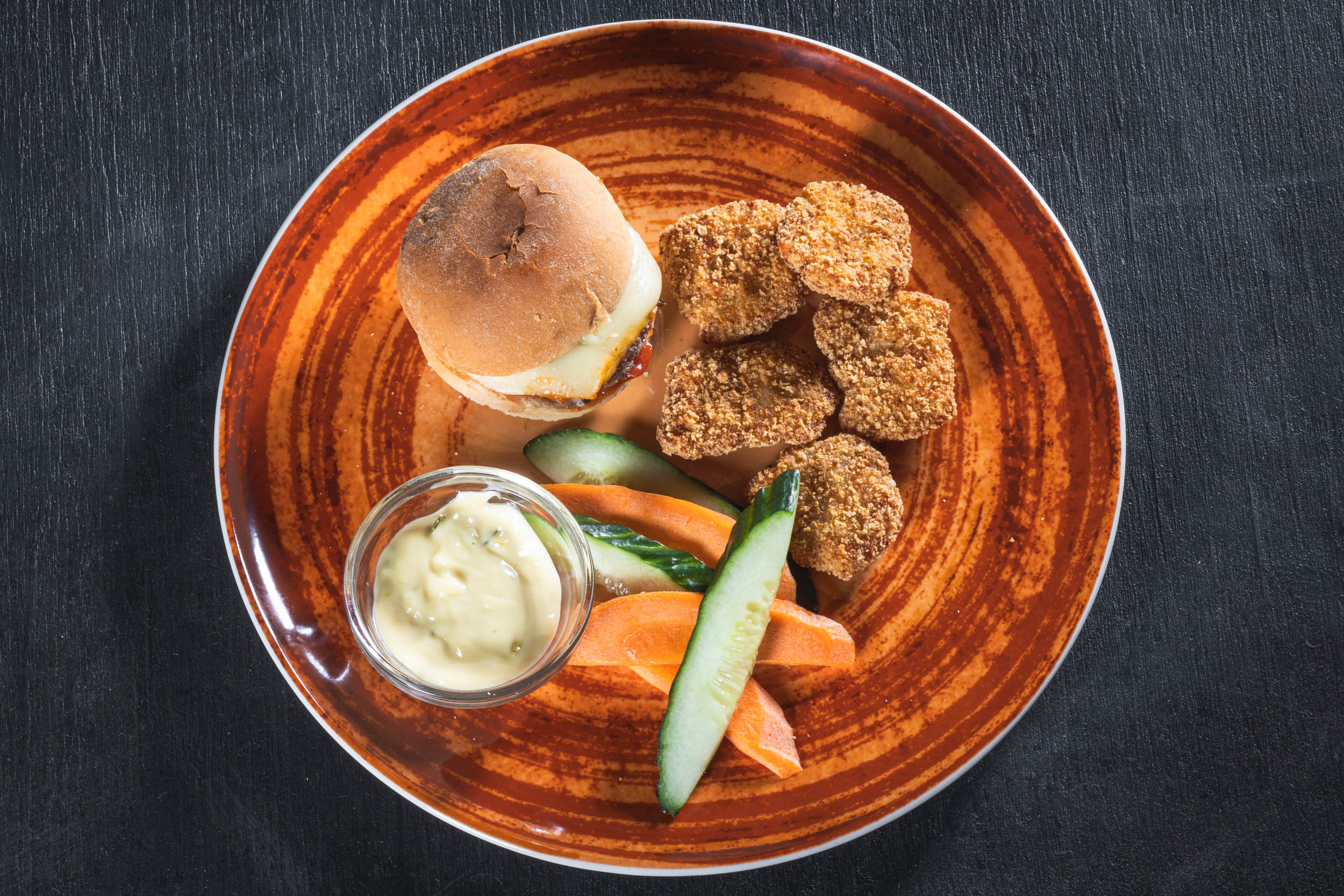 Slider-kokoinen hampurilainen – sisällä pihvi, cheddarjuustoa ja ketsuppia. Kananugetteja, kurkkutikkuja, porkkanatikkuja, kurkkumajoneesi -dippi