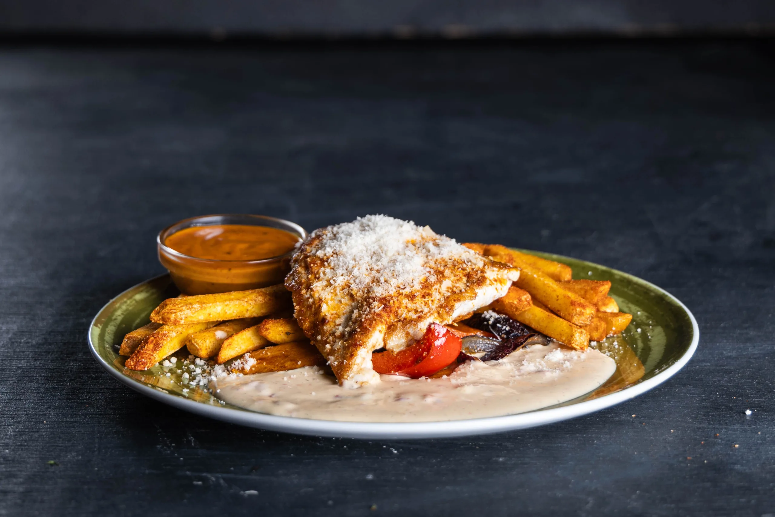 Pariloitua kanan rintafileetä, kermaista paholaisenkastiketta, parmesaanimurua, grillikasviksia.