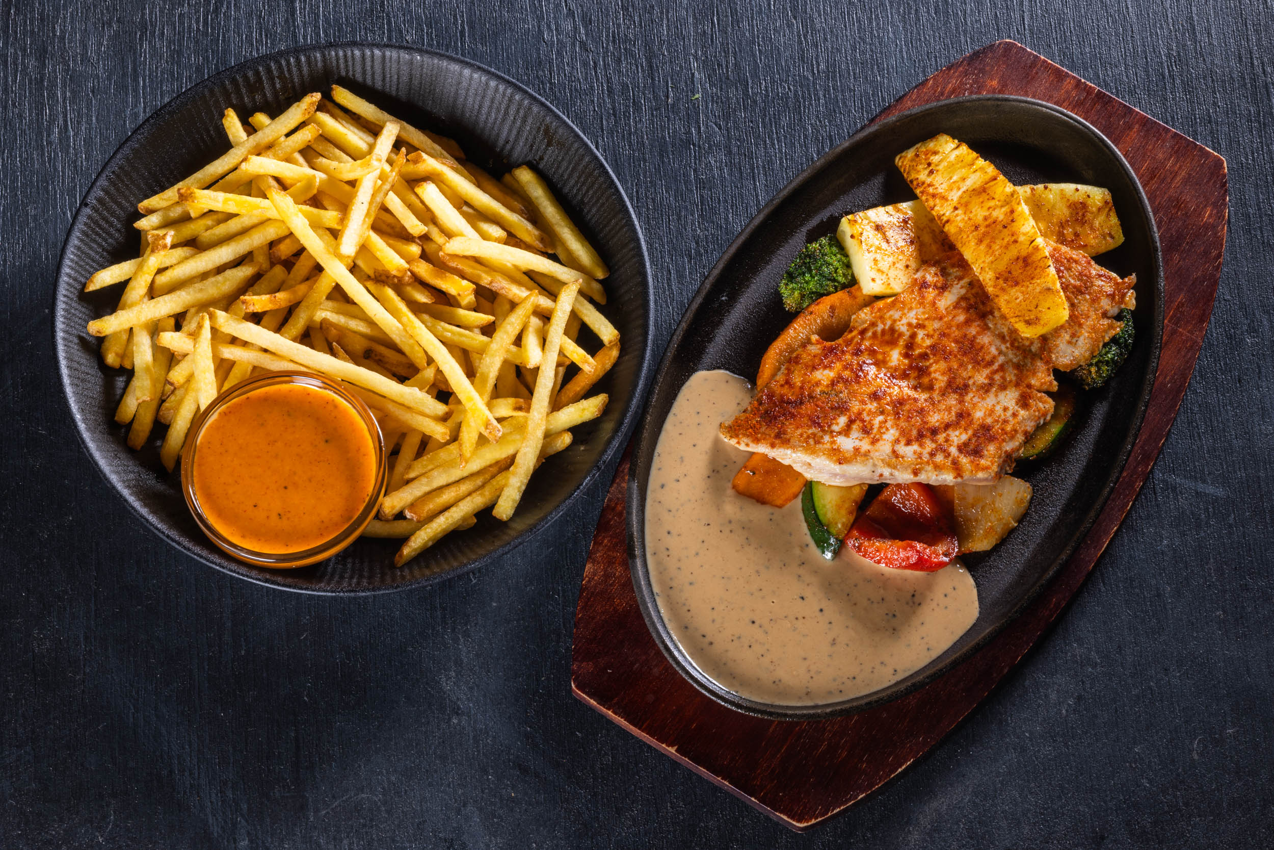 Kermaista pippurikastiketta, grillikasviksia, pariloitua ananasta.