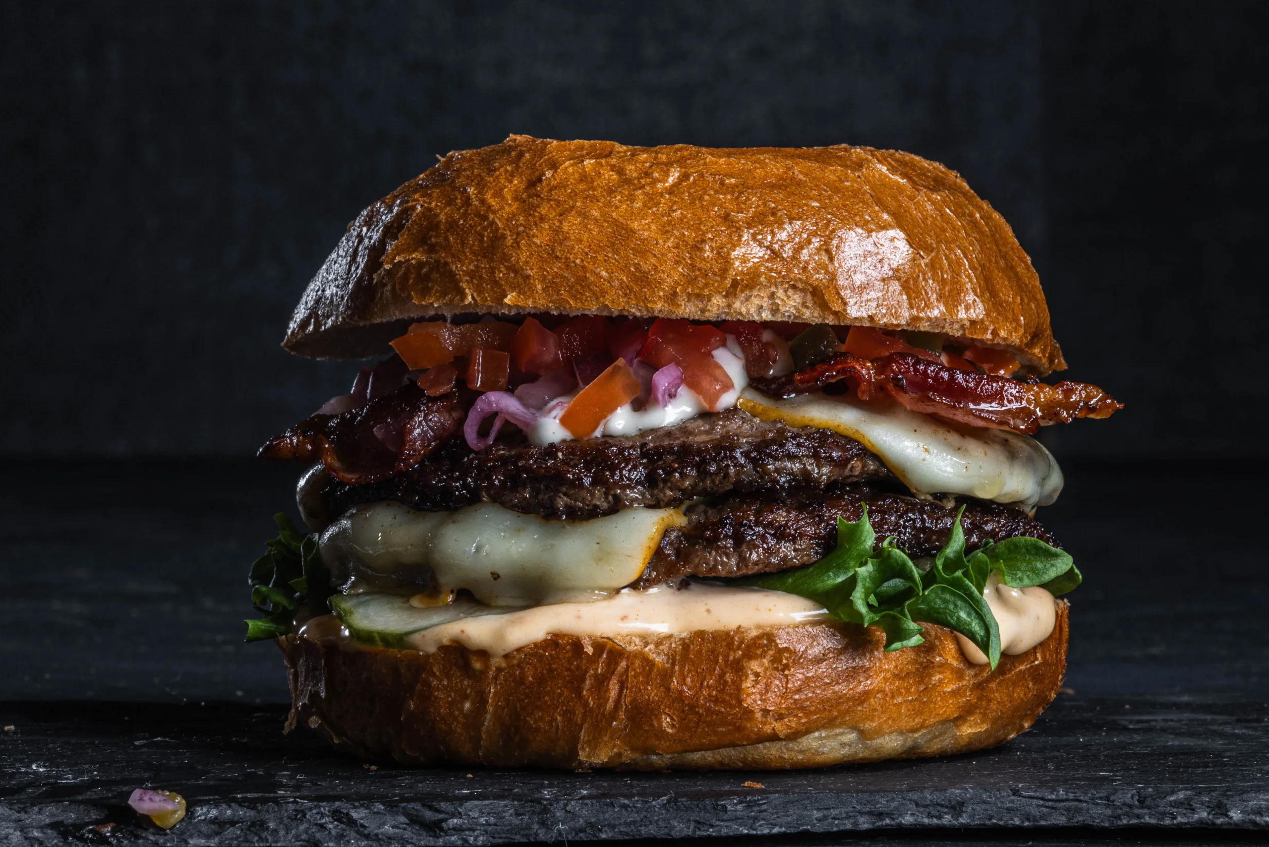 Kaksi burgerpihviä, rapeaa pekonia, kermaista Port Salut -juustoa, chipotlemajoneesi, Talon majoneesia, Pico de Galloa, Talon maustekurkkua, salaattia.