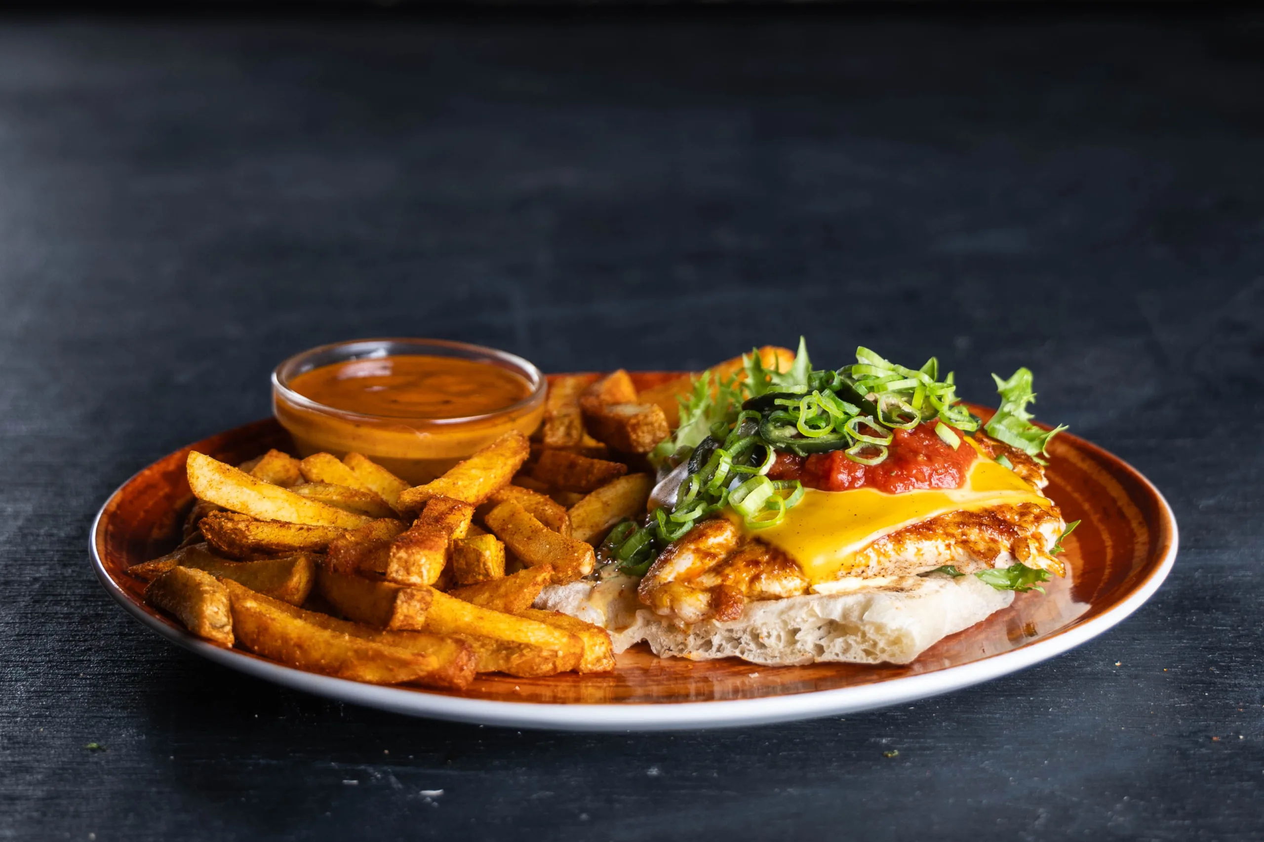 Rapean leivän päällä pariloitua kanan rintafileetä, cheddarjuustoa, mango-chilimajoneesia, tomaattisalsaa, pikkelöityä jalapenoa, kevätsipulia ja majoneesia.