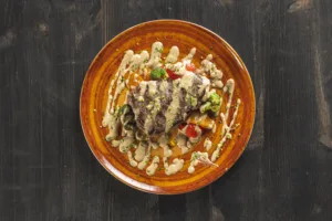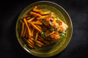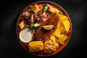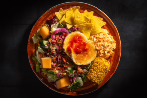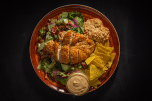 MMjölkfri portion,PGPortionen kan beställas glutenfriKycklingsbröstfilé eller panerad kyckling, coleslaw sallad, Pico de Gallo, gurka, marinerad rödlök, sallad, salladslök, nachos, örtolja, chipotlemajonnäs, pumpafrön
