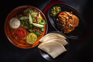 LLaktosfri portion,PGPortionen kan beställas glutenfriGuacamole, Salsa Roja, crème fraîche, Pico de Gallo, salladslök