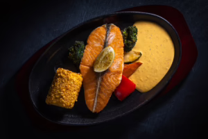 LLaktosfri portion,PGPortionen kan beställas glutenfriHalstrad laxmedaljong, Aura-sås