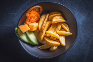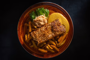 LLaktosfri portionFriterade halloumipinnar, coleslaw sallad, chipotlemajonnäs