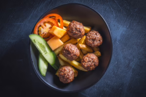 MMjölkfri portion,PGPortionen kan beställas glutenfri100% nötkött. Innehåller gurka, tomat och cantaloupemelon.