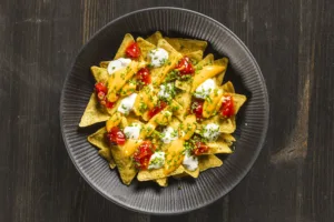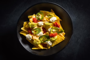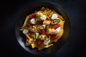 Nachos, panerad kyckling, guacamole, salsa, crème fraîche, varm ostsås, picklad jalapeño