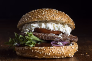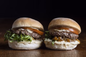 PGPortionen kan beställas glutenfriNötbiff, cheddarost, krossad vitlök, vitlöksmajonnäs, sallad, marinerad rödlök.