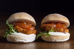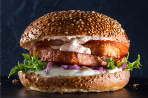 PGPortionen kan beställas glutenfriPanchos grönsaksbiff, cheddarost, vitlöksmajonnäs, tomat, sallad, marinerad rödlök.
