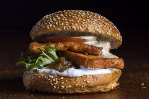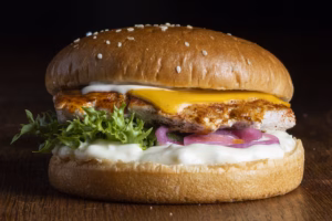 PGPortionen kan beställas glutenfriKycklingbröstfilé, Husets majonnäs, gurkmajonnäs, cheddarost, marinerad rödlök, sallad.