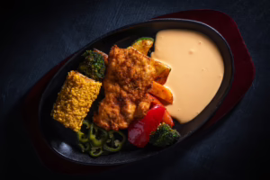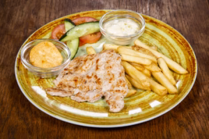 LLaktosfri portion,PGPortionen kan beställas glutenfriEnligt din val grillad kycklingfile eller panerad kyckling, Aura-sås