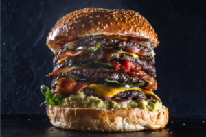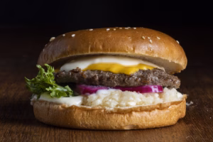 50 g nötbiff, krispig bacon, Monterey Jack -ost, Husets majonnäs, marinerad rödlök.