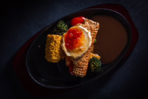 LLaktosfri portionVarm ostsås, salladslök. På ett knaprigt bröd finns det Salsa Roja, coleslaw sallad, Pico de Gallo, sallad.