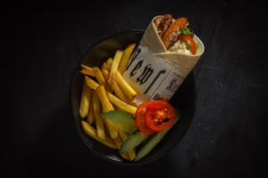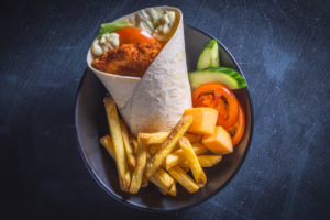 Inuti vetetorillawrapen finns det panerad kyckling, tomatmajonnäs, parmesan-majonnäs, Husets inlagd gurka