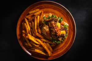LLaktosfri portionVarm ostsås, Chefs bbq, rostad lök. På ett knaprigt bröd finns det Salsa Roja, coleslaw sallad, Pico de Gallo, sallad.