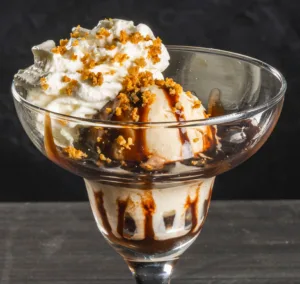 LLaktosfri portionPepparkaksglass, chokladsås, vispgrädde, pepparkakssmulor