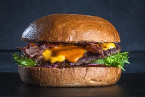 BGPortionen kan beställas glutenfriTvå nötbiffar, cheddarost, Monterey Jack -ost, bacon, chipotlemajonnäs, Husets inlagd gurka, sallad, marinerad rödlök.