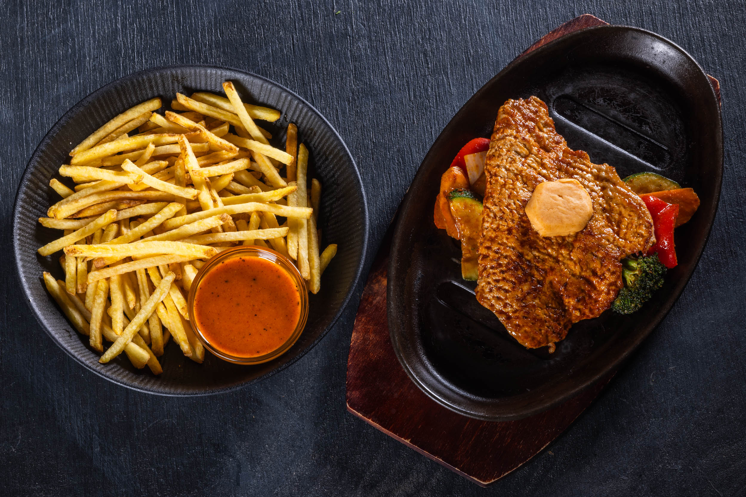 Portionen serveras med Panchos thin & crispy fries, Husets pommes frites, Husets klyftpotatis, bakpotatis, sallad eller grillade grönsaker. Potatisen (ej bakpotatis) serveras med Panchos remudipp.