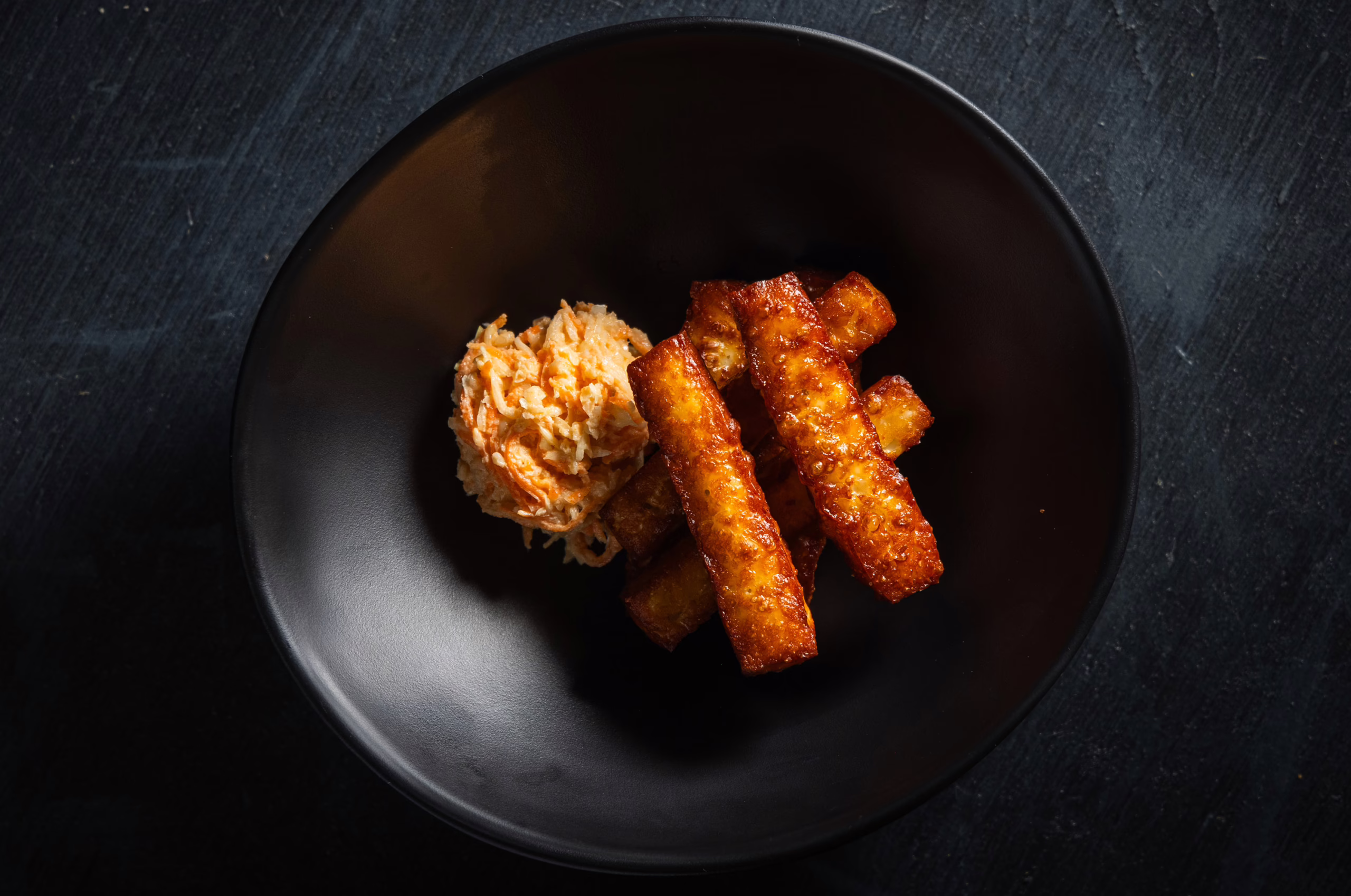 Friterade halloumipinnar, coleslaw sallad, chipotlemajonnäs