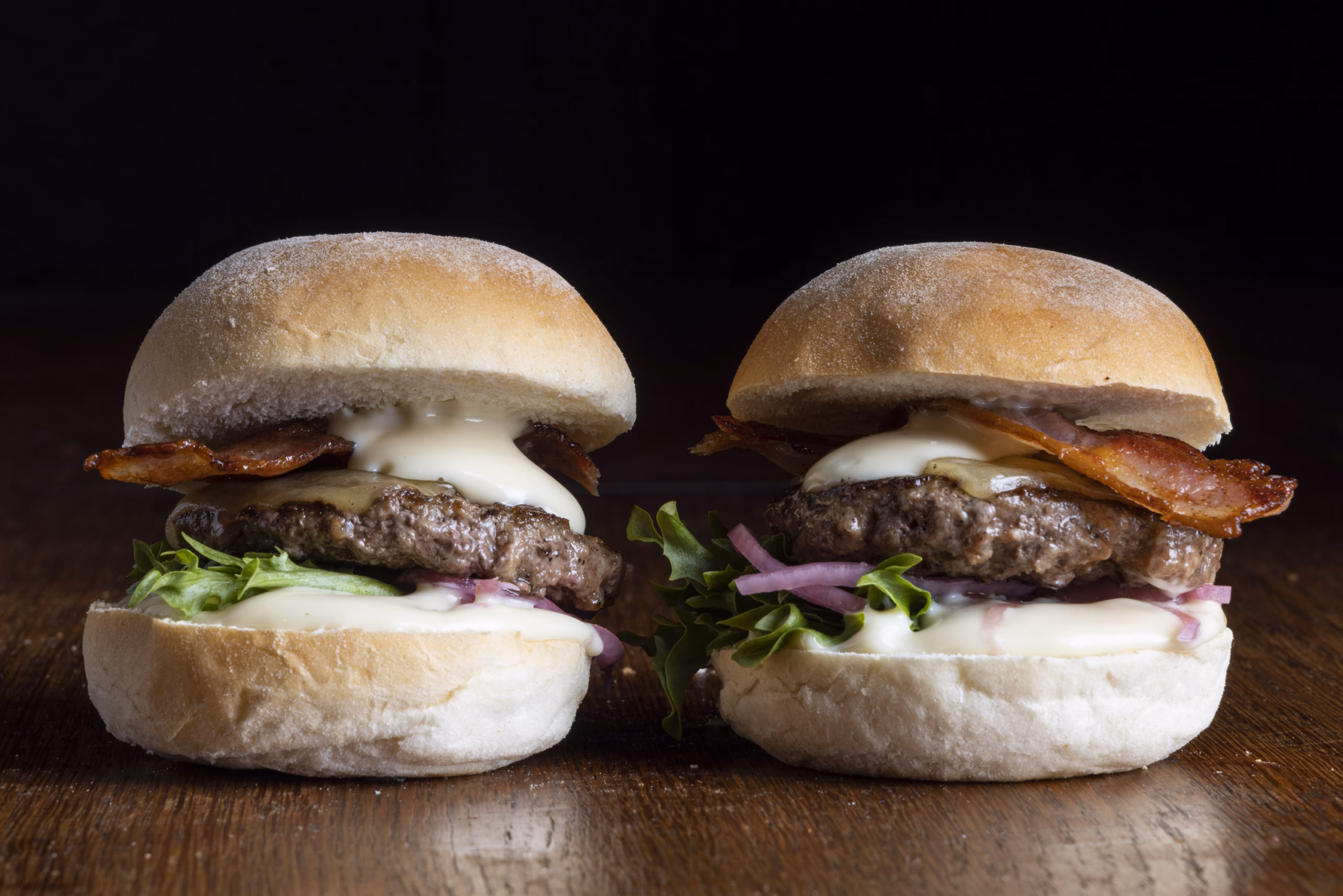 50 g nötbiff, krispig bacon, Monterey Jack -ost, Husets majonnäs, marinerad rödlök.
