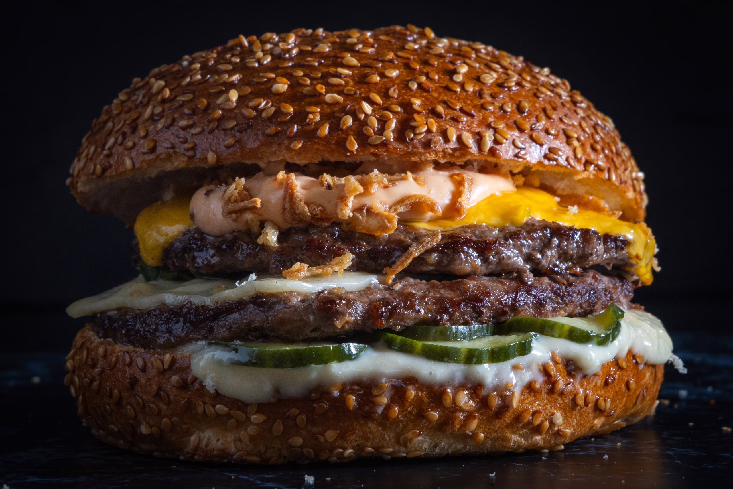 Cheddarost, Montery Jack -ost, parmesanmajonnäs, tomatmajonnäs, Husets inlagd gurka, rostad lök
