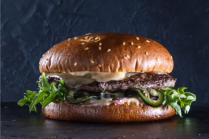 Nötbiff, krossad vitlök, vitlöksmajonnäs, cheddarost, marinerad rödlök, sallad.